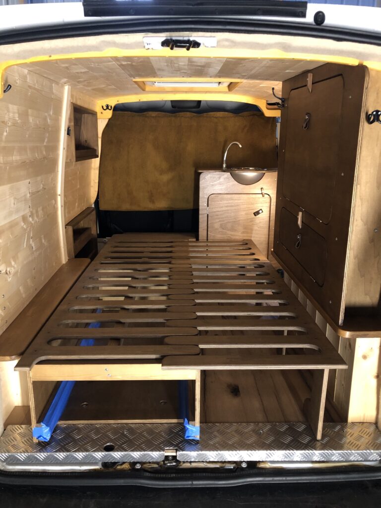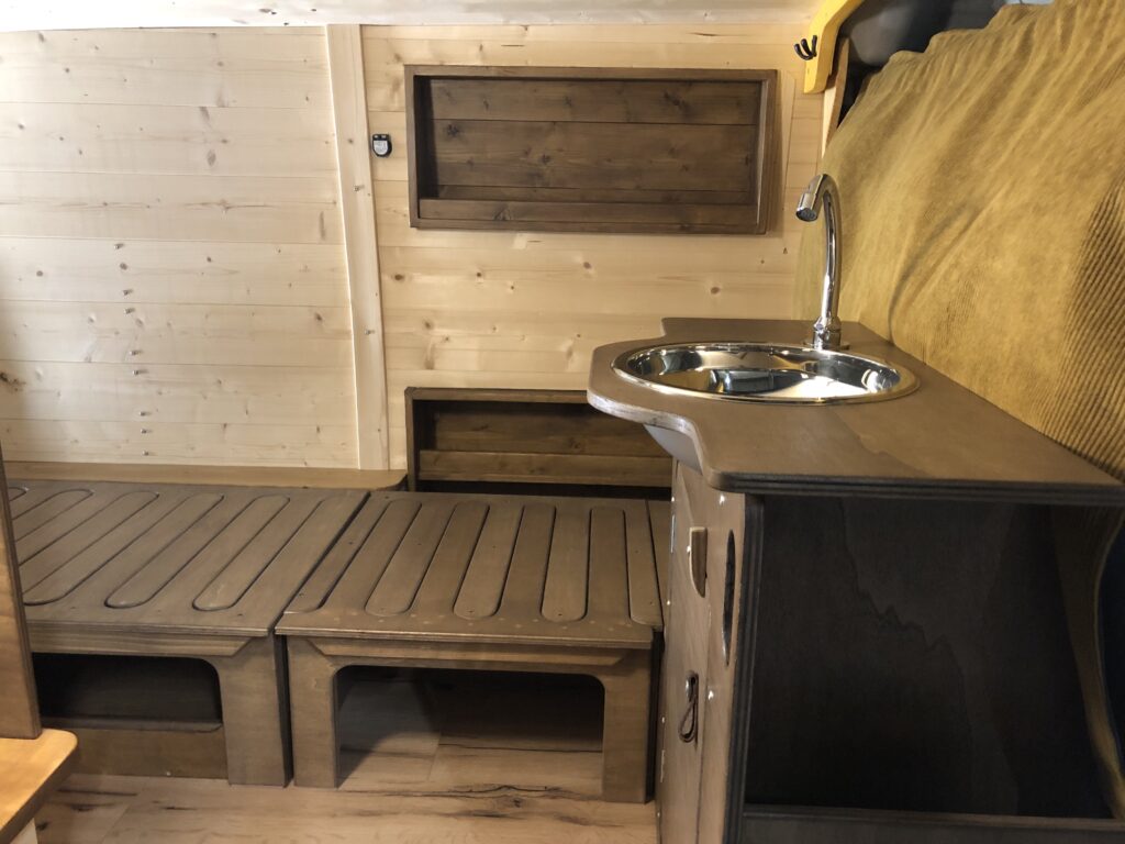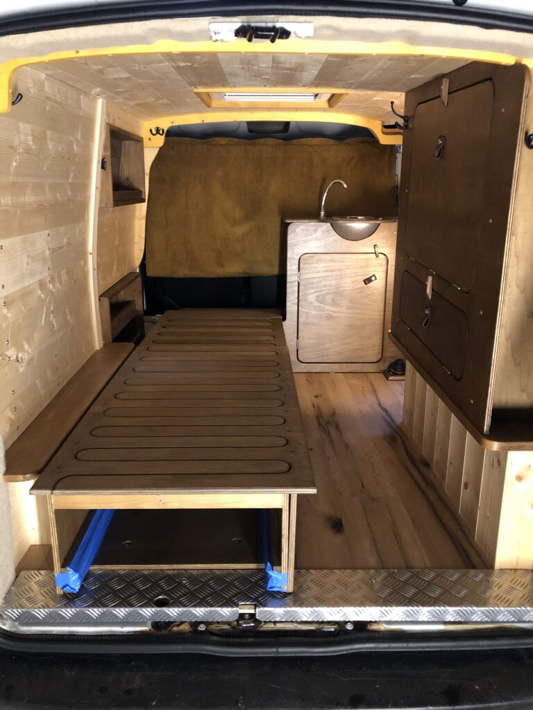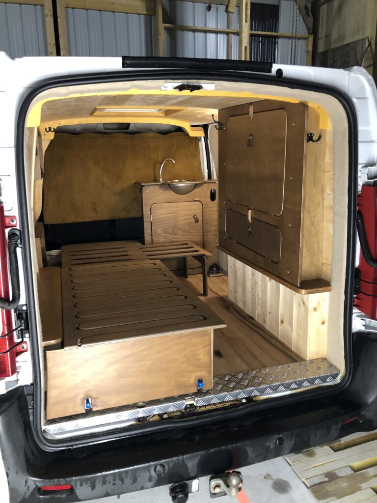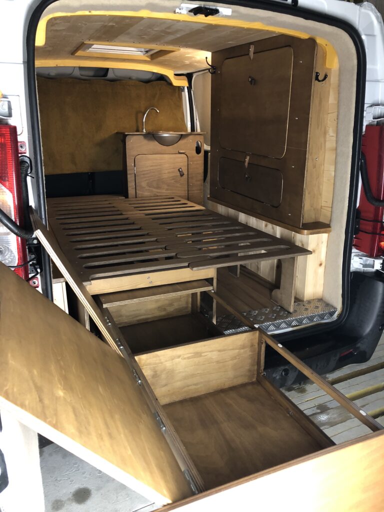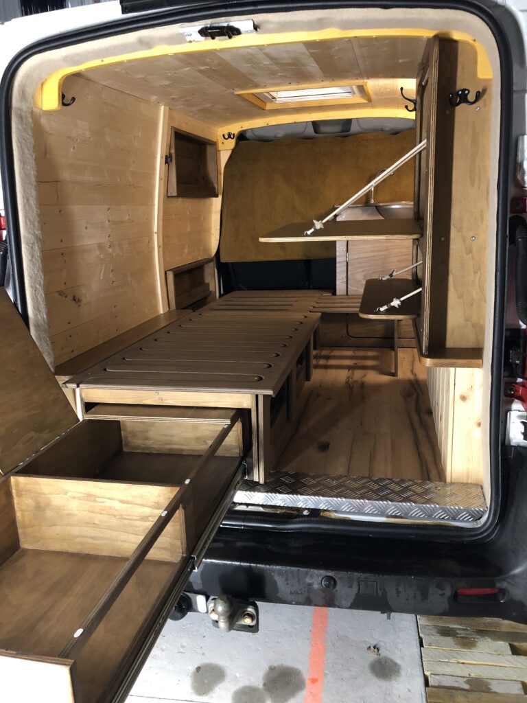 Ce « van » a changé de propriétaire. Marc et Séverine les acquéreurs m’ont demandé de modifier la banquette lit qui de base n’était prévue que pour une personne. Voici le résultat.